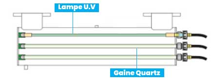 Le stérilisateur à UV se compose d'une ou plusieurs lampes U.V intégrées dans une gaine en Quartz. L'eau passe le stérilisateur et circule autour des gaines et ainsi est exposée aux Ultra-violets. Ainsi les virus, bactéries et autres micro-organismes sont éliminés, rendant alors l'eau bactériologiquement potable.